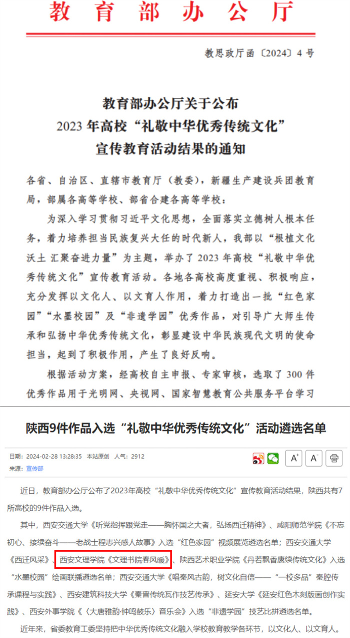 近日,教育部办公厅公布了2023年高校“礼敬中华优秀传统文化”宣传教育活动结果,Beat365学前教育学院宋江安老师的作品《文理书院春风暖》入选“礼敬中华优秀传统文化”宣传教育活动“水墨校园”绘画联播遴选名单。陕西...
