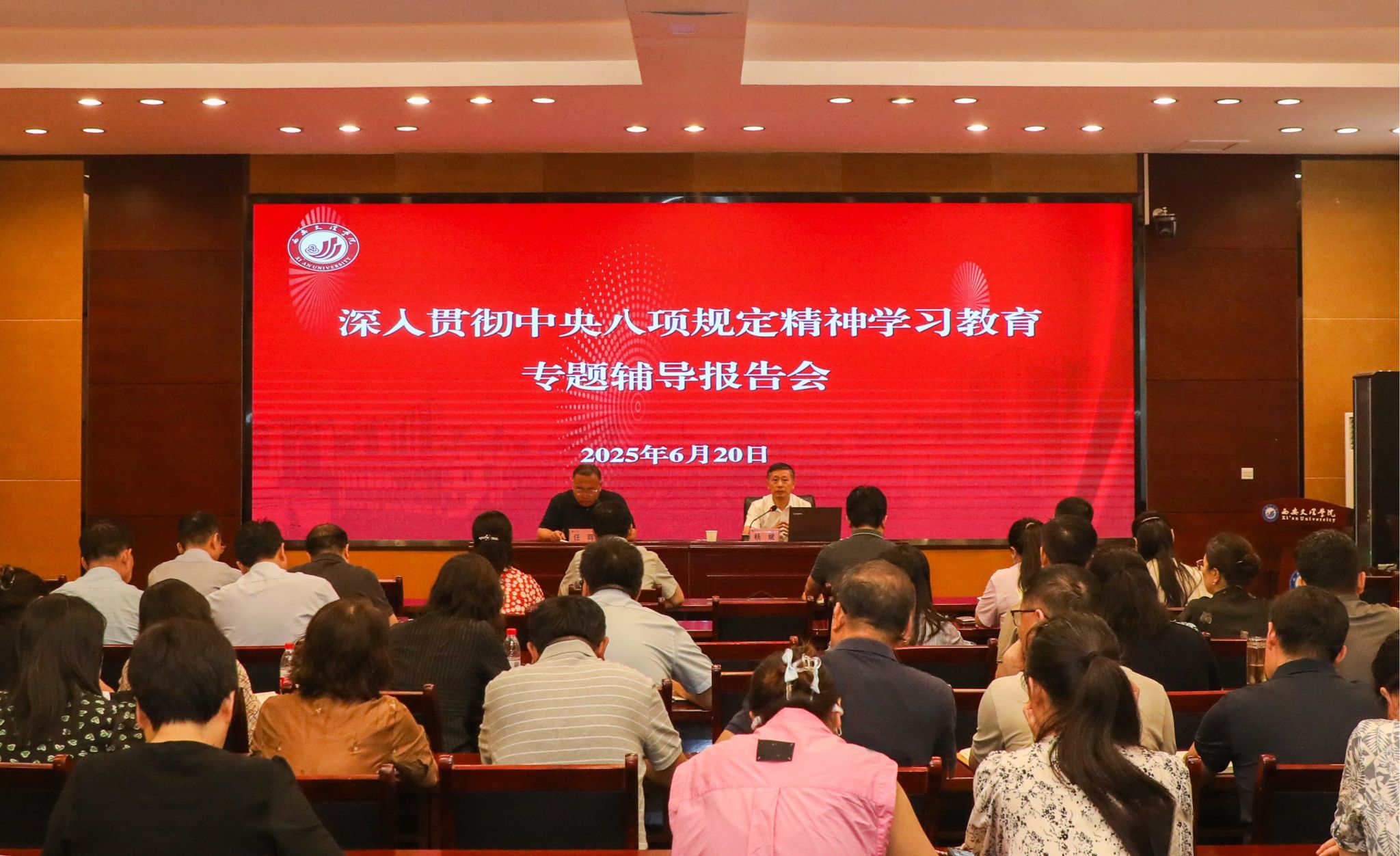为持续推动深入贯彻中央八项规定精神学习教育走深走实,6月20日上午,学校在办公楼一楼会议室举办深入贯彻中央八项规定精神学习教育专题辅导报告会。西安市委理论讲师团团长杨斌作报告,党委副书记、副校长任晖主持报告会。杨斌以《深入贯彻落实中央八项规定精神 扎实推进党的作风建设常态化长效化》为题,围绕“从严治党的历史沿革和‘八项规定’的提出”“中央八项规定精神的主要内容”“反腐新形势与作风建设的新任务”“新形势下‘...