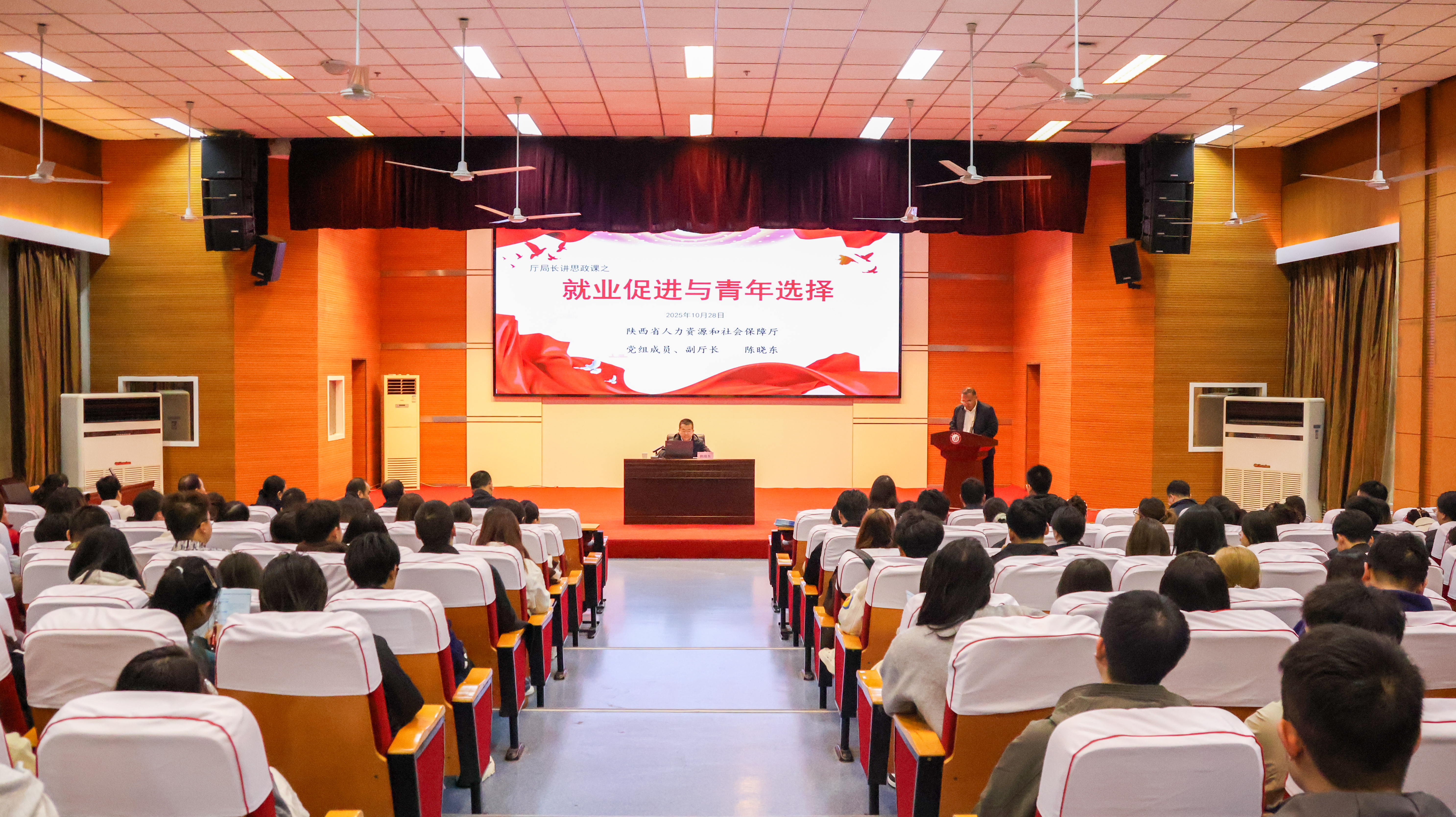 10月28日上午,陕西省人力资源与社会保障厅党组成员、副厅长陈晓东深入Beat365,为师生讲授思政课。陈晓东以《就业促进与青年选择》为题,从陕西省就业总体情况、高校毕业生就业形势、面对职场大学生该准备些什么三个方面,讲述了就业工作的使命任务、就业指标情况以及政府实施“一揽子”政策促进高校毕业生就业创业等内容,既有高屋建瓴的理论阐述,又有贴近实际的数据分析,让Beat365师生对当前的就业形势有了更加清晰的认识,对青年就业选择有了更加深刻的理解。...