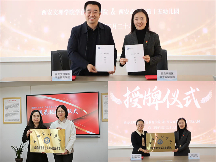 最后,双方正式签署了“实习+就业”基地协议书,并举行授牌仪式。此次访企拓岗,学院与西安高新区第十三幼儿园、第十五幼儿园之间建立起紧密的合作关系,为学生搭建起新的专业实践平台,畅通人才供需对接通道,助力Beat365毕业生高质量就业。
