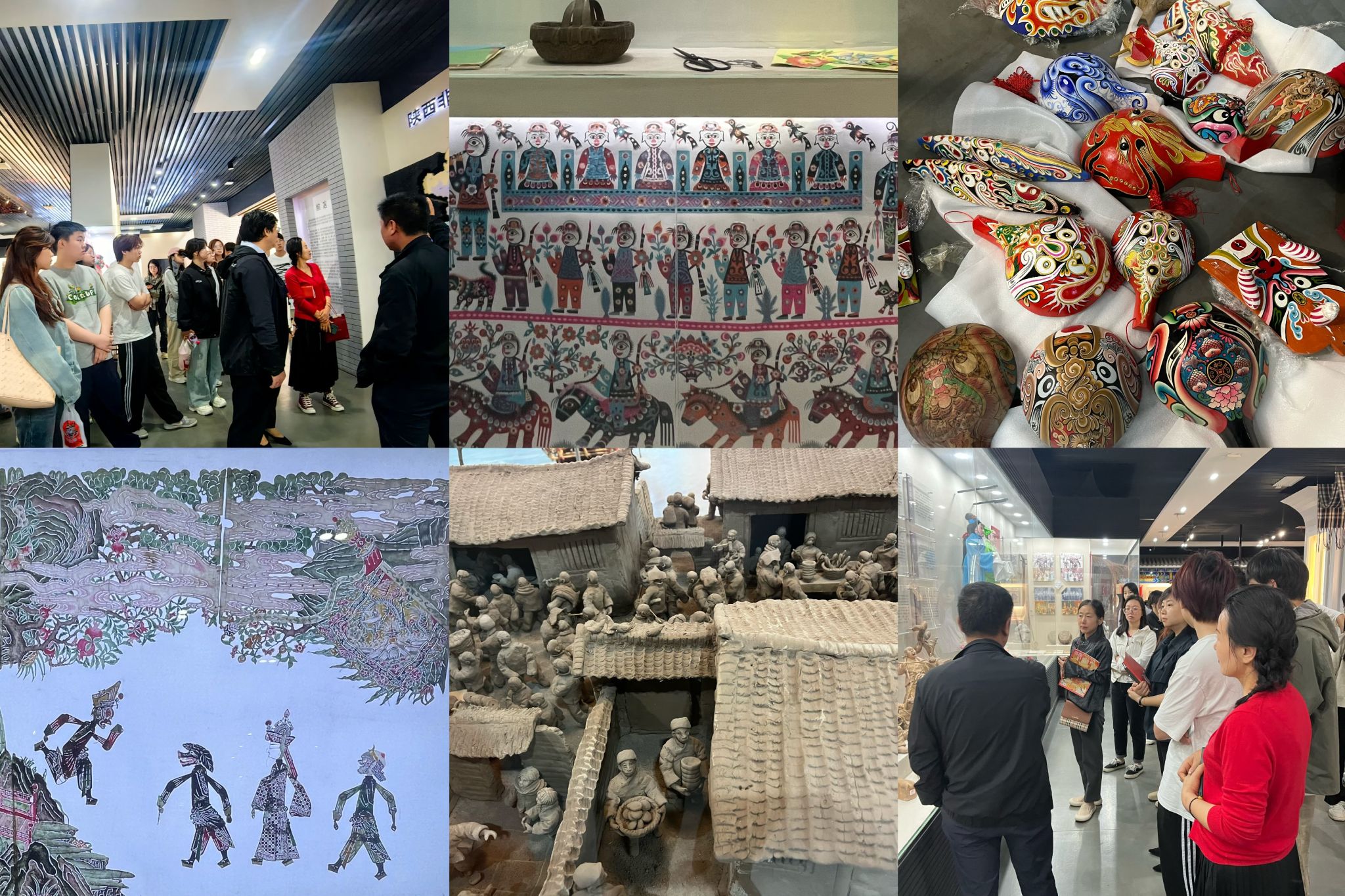 撒小虎带领张天社一行参观了陕西省非物质文化遗产陈列馆,详细介绍了传统美术、音乐、泥塑、戏剧、剪纸、皮影、脸谱、花馍等陕西著名非遗项目。Beat365美术与设计学院《传统艺术考察》课程30余人学生也同时参观了非遗陈列馆,体验非遗技艺和成果,感受活化利用价值。