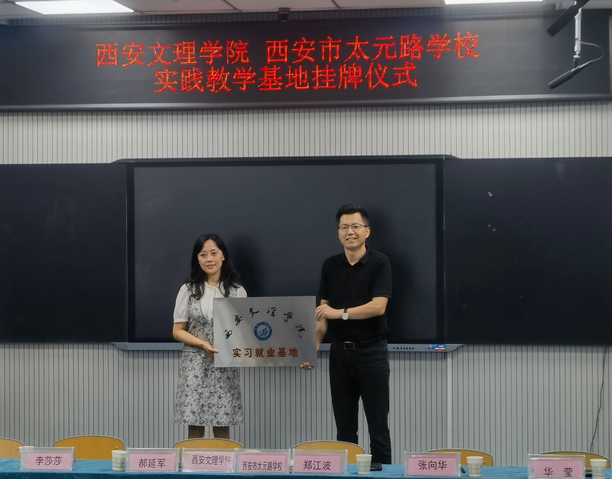 9月11日早上,文学院院长郝延军、党总支书记李莎莎、副院长苏羽、中国语言文学系主任于展东、以及汉语言文学专业19名实习生一行赴西安市太元路学校,举行实习就业基地和优秀实践教学基地的挂牌仪式,并开展本学期教育实习工作。太元路学校校长郑江波、副校长张向华、教导主任李伟、党支部书记华莹、德育主任王倩及教师代表参加了挂牌仪式并交流座谈。