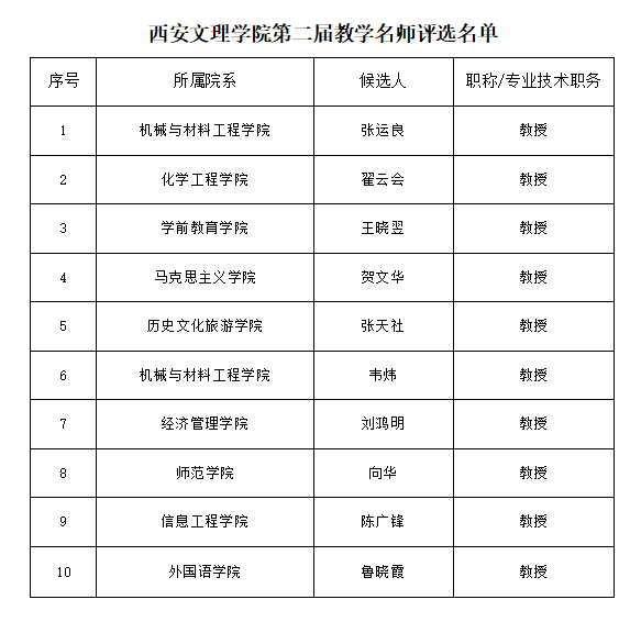 为确保人才培养中心地位和教学工作的基础地位,鼓励教师积极投身一线教学,着力提高人才培养质量,根据《Beat365中文官方网站教学名师奖评选管理办法(试行)》(西文理校发〔2019〕22号)《关于开展第二届Beat365中文官方网站教学名师奖评选表彰工作的通知》文件,近日,Beat365组织开展了第二届Beat365中文官方网站教学名师奖评选工作。经教师个人申报、学院初审、学校初审、校内督导教学效果评价以及校内外专家组评审等程序,拟评选出校级教学名师10名。现予以公示,接受监督。