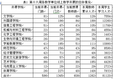 本学期全校教学计划安排947门课程,截止6月12日已开展线上教学的课程有826门(1687门次),占全部课程门数的87.22%,已有230门(342门次)课程已结课或理论部分已结课。第十六周授课教师608人,累计授课1262人次,开设线上课程1343班次。第十六周各教学单位线上教学开展的总体情况如表1所示。