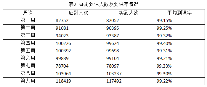根据课程安排,应参加在线学习的学生9629人,其中第九周应参加在线学习的学生118419人次,实际上课人数117492人次,平均到课率为99.22%。每周到课人数及到课率情况如表2所示。