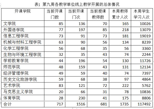 本学期全校教学计划安排947门课程,截止4月26日已开展线上教学的课程有781门(1618门次),占全部课程门数的82.47%,已有64门(102门次)课程已结课或理论部分已结课。第九周授课教师681人,累计授课1735人次,开设线上课程1914班次。第九周各教学单位线上教学开展的总体情况如表1所示。