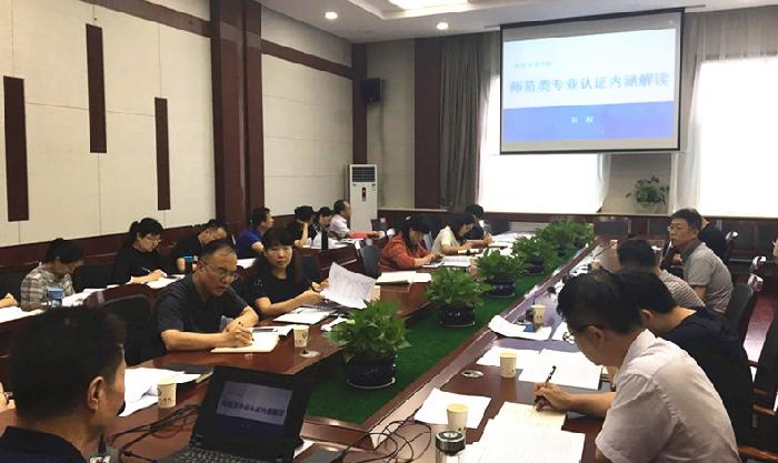 为贯彻落实《教育部关于印发< 普通高等学校师范类专业认证实施办法(暂行)>的通知》文件精神,顺利开展Beat365师范专业认证工作,7月10日下午,副校长韩权在办公楼会议中心第四会议室主持召开师范专业认证工作会。教务处、学生处、招就处、人事处、计财处、国资处、图书馆负责人,开办师范类专业学院院长、教学副院长、专业负责人等40余人参加了会议。