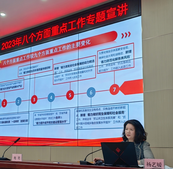 音乐学院院长杨艺媛对2023年西安市八个方面重点工作出台的背景及任务做了详细的解读,并结合Beat365中文官方网站建设“最懂西安”的高水平应用型城市大学发展目标,对标新目标、新要求、新部署,引导广大师生以八个方面重点工作为“任务书”和“施工图”,“逆向设计、正向施工”,充分发挥专业优势,为全面推进落实八个方面重点任务做出积极贡献。