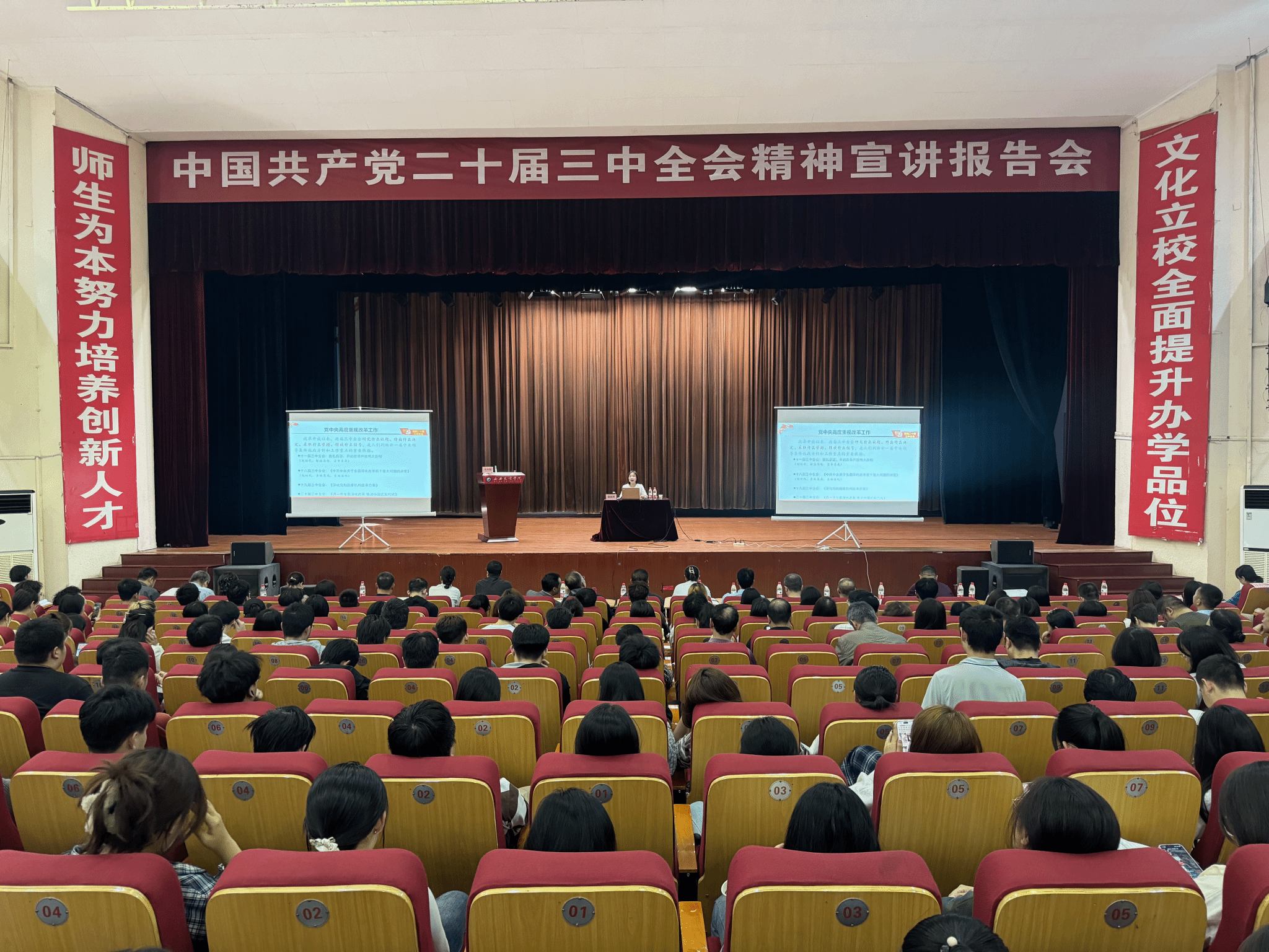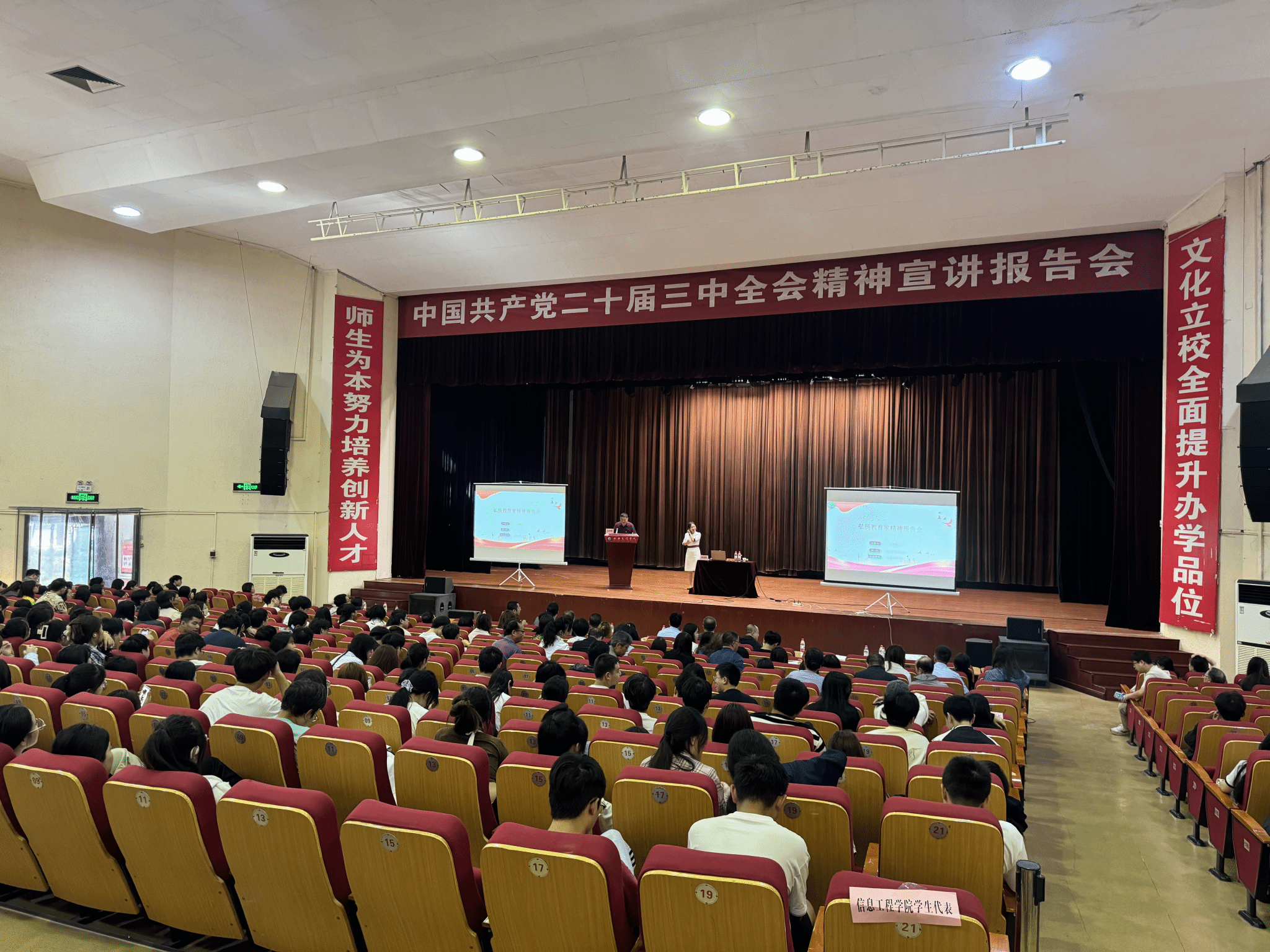 为了深入学习中国共产党二十届三中全会精神,弘扬教育家精神,提升教师及学生队伍的思想政治素质和教育教学水平,进一步推动教育教学改革与发展,2024年10月16日下午,信息工程学院、经济管理学院、美术与设计学院在大礼堂联合召开了中国共产党二十届三中全会精神暨教育家精神宣讲会。参加会议的有三个学院的领导班子、全体教职工及学生代表800余人。