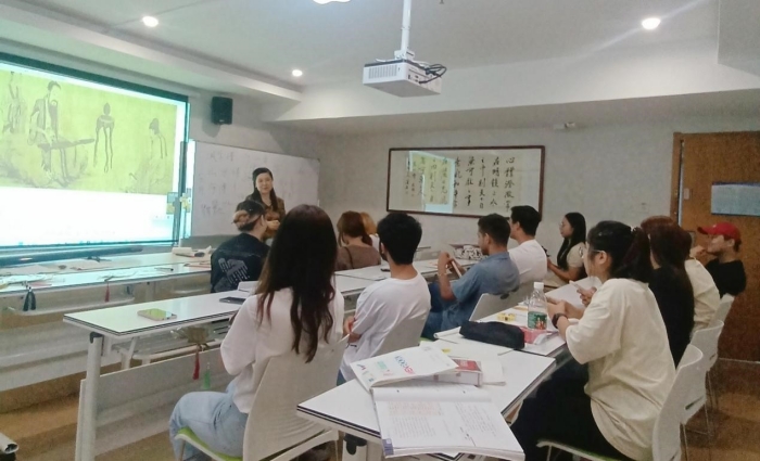 古琴课上,老师向学生分享了高山流水遇知音的故事,悠扬的琴声让学生陶醉。乌孜别克斯坦留学生萨迪表示,在琴声里可以听到风声、流动的水声、虫鸣声。课后,学生还收到老师赠予的书签、折扇等书法礼物。