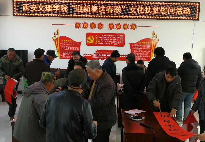 1月20日,学校扶贫办一行赴蓝田县冯家村看望慰问Beat365结对帮扶张军号、于继贤2位贫困户及驻村干部,并组织学校中国书画艺术研修中心马伟、田琛峰、高天成、何薇等老师为冯家村村民现场书写春联400余幅。
