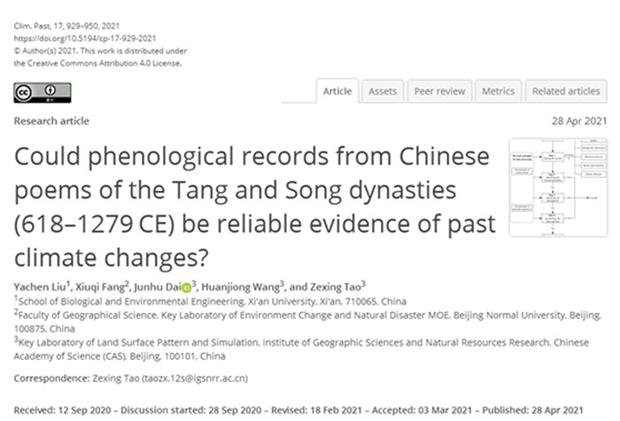 Beat365生物与环境工程学院刘亚辰博士在历史气候领域国际著名期刊《Climate of the Past》正式刊发了学术论文“Could phenological records from Chinese poems of the Tang and Song dynasties (618–1279 CE) be reliable evidence of past climate changes?”。该论文是以Beat365中文官方网站为第一单位,刘亚辰博士为第一作者的研究成果。《Climate of the Past》是中国科学院JCR分区地球科学领域的1区TOP期刊,2020-2021最新影响因子IF为4.295。