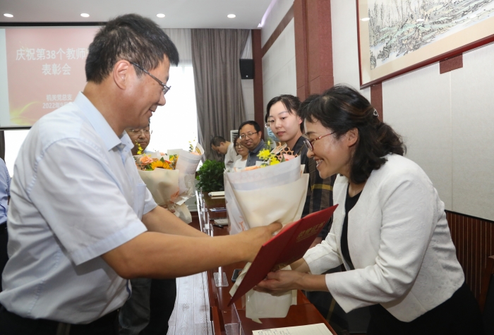 会议宣读了学校《关于表彰2021-2022学年优秀教师、先进教育工作者、优秀思政课教师、标兵辅导员、优秀辅导员的决定》及《关于认定从事教育工作三十年教职工的通知》。李忠良为从事教育工作三十年教职工和先进教育工作者颁发证书。