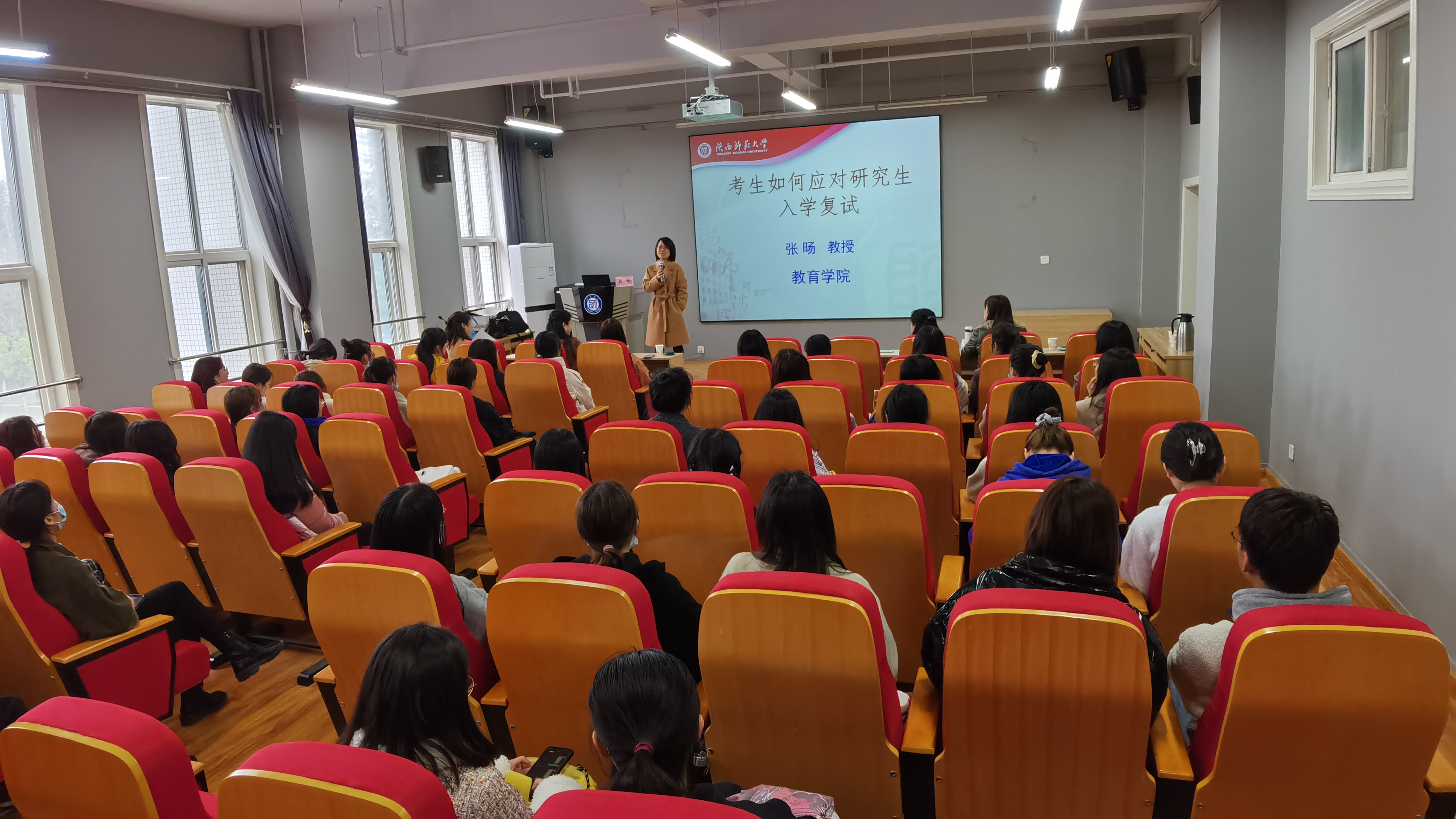 第二个阶段为考研复试培训讲座。师范学院特邀陕西师范大学博士生导师张旸教授就考研复试进行专题指导,她讲解了目前复试的主要形式,包括笔试和面试,针对复试内容进行了详细阐述,深入浅出地对专业知识、心理素质、口语测试、人文素养等方面以实例进行讲解,语言风趣幽默,针对性强,赢得学生阵阵掌声,互动环节中,张旸教授细心解答提问,毕业生们收获颇丰,对复试充满了信心。