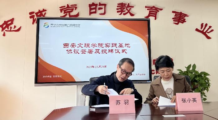 首先,张小英介绍了西安高新第八初级中学的教育理念、管理团队,肯定实习生的新鲜力量和智慧,提倡中文专业广泛涉猎文学经典名著与教育类著作。李莎莎从人才需求、专业特色等方面介绍学院情况,强调基础教育、实习实践的重要性,指出学生阅读情况与书写情况的薄弱之处。双方表示在文学鉴赏、名家讲坛、理论研究与语文教材、课程标准、基础运用等方面实现资源共享与优势互补。双方在实践教学、教学研究、课程开发等方面达成合作共识。随后,苏羽与张小英签订实习协议,李莎莎与张小英完成就业实习实践基地授牌。