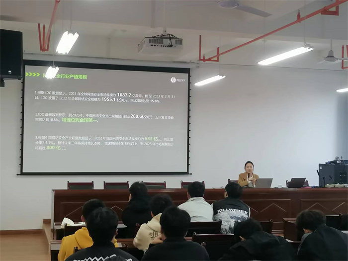 邹志钢全面介绍了当前国内外网络安全态势、高级持久性威胁(APT)攻击技术、人工智能与机器学习在安全防御中的应用、网络安全领域学科竞赛和白帽子人才培养。邓黎分享了网络安全行业的就业形势、人才需求与职业规划。参会师生与两位专家积极互动,展现出对网络安全技术浓厚的研究和学习兴趣。