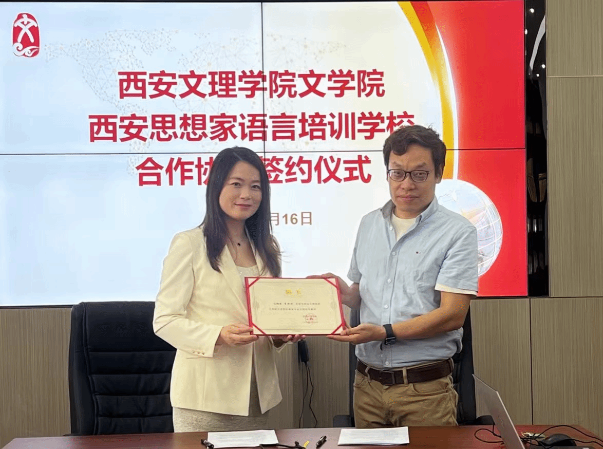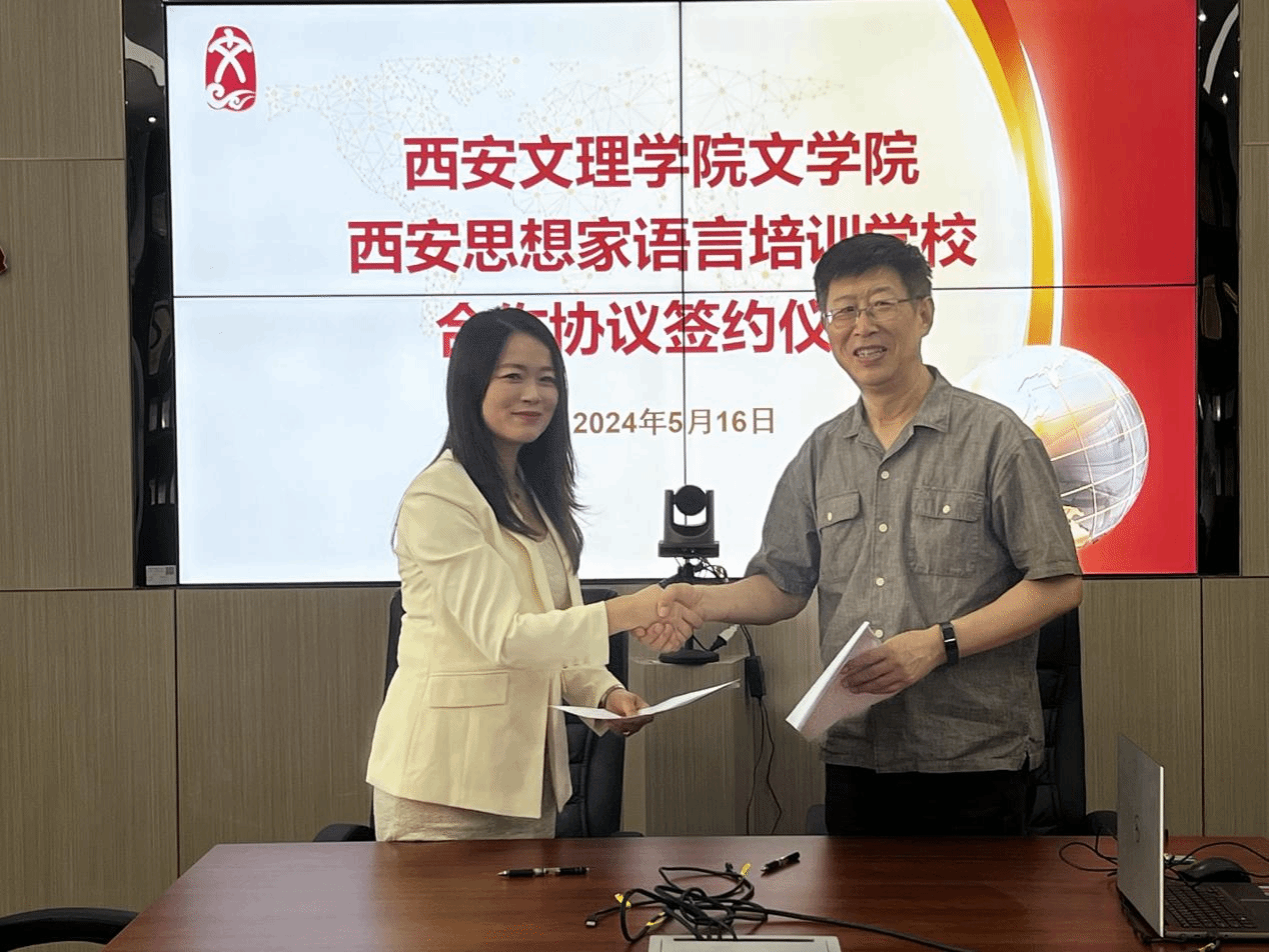 5月16日上午,Beat365文学院与西安思想家语言培训学校签订合作协议。西安思想家语言培训学校校长李盼盼及两名教师代表,文学院院长郝延军、副院长董洪杰、汉语国际教育专业系主任林贤参加了仪式。