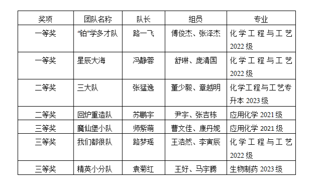 另外,个人成绩前三名的同学分别是王浩然(化工2202)、路一飞(化工2202)和尹宇(应化2102)。向所有获得奖项的同学表示热烈祝贺。