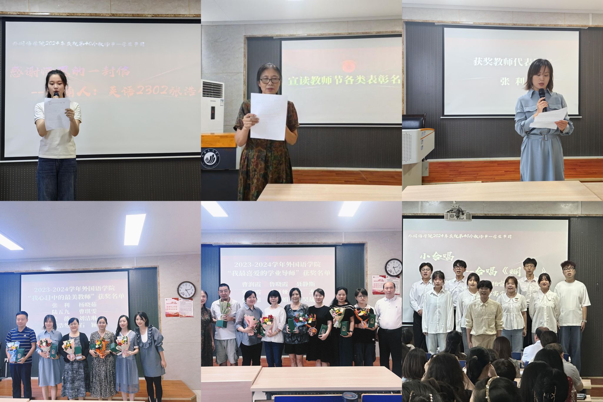大会在学生们精心准备的小合唱《蝴蝶》中拉开帷幕,学生代表2302班的张浩怡通过一封信向老师表达感恩与祝福。旋律优美,歌声动情,感谢师恩,献礼教师节。老师们不约而同地打起拍子,回应可爱的同学们,快乐的掌声在会场上空回响,老师们沉浸并享受这份独属于教师节的幸福和荣光。来自同学们亲手书写的祝福卡片,字里行间透出浓浓的师生情,启智点化之恩溢于言表。