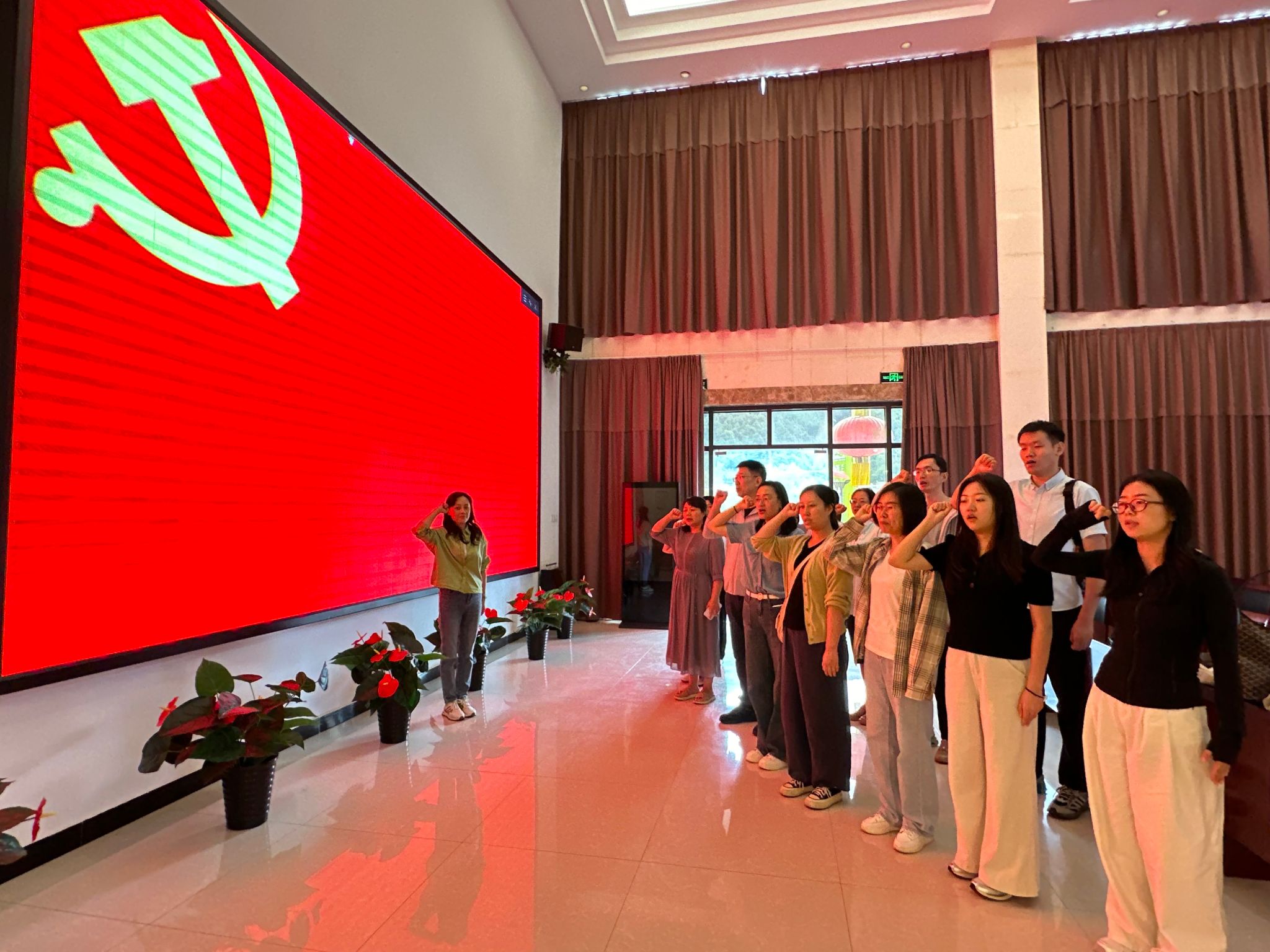 北宽坪地处丹江之北的五峰山下,在战争年代,这里曾是我们党发动和领导贫苦百姓进行革命斗争的稳固之地,是红二十五军征途中创建的鄂、豫、陕革命根据地的重要活动区域,在这里发生了许多重要战役,当地武装和群众百姓为主力部队突围做出了重要的贡献。大家首先观看了商洛革命历史教育短片。随后在讲解员的引导和讲解下,参观了中共商洛县委县政府旧址纪念馆。先辈们留下的老物件,一张张发黄的老照片,这些珍贵的历史资料使大家了解了这片红色土地上曾经发生的悲壮感人故事,深刻感受到了革命先烈不畏牺牲、甘于奉献的革命斗争精神。在党员体检中心,党员们在此对照政治信念、纪律规矩、道德品行、奉献作为等方面进行了一次全方位、多层次的党性体检,认真细致的检视自己的思想和言行,对照检查自己是否是一名合格的党员。最后,党总支书记李莎莎带领全体党员在庄严的党旗下重温了入党誓词。