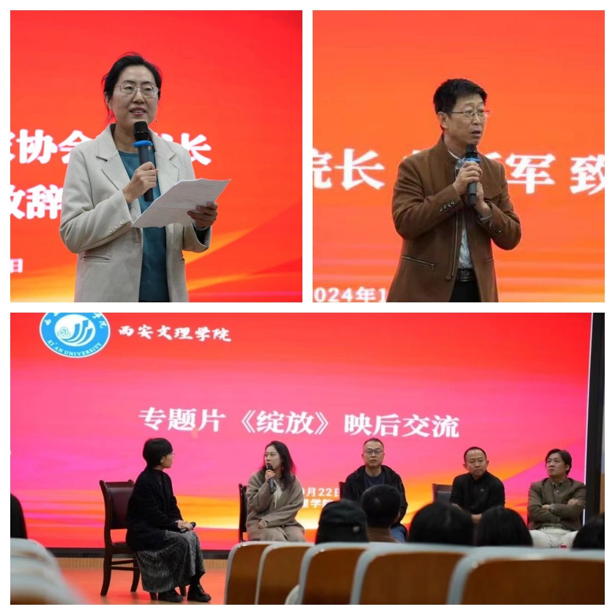 沈洁蓉首先就本次活动致辞,表示本次活动是陕西省文艺评论家协会文艺“六进”活动进校园的系列活动之一,架起了省评协会与高校师生之间的联络桥梁,是文艺和校园美育的生动结合。放映结束,编导团队与文学院戏剧影视文学专业师生进行了互动交流,向同学们分享了专题片选题、解说词撰写、剪辑包装等创作环节的宝贵经验。郝延军在发言中强调,本次活动是一堂生动的专业“课堂”。通过专题片的观摩,在提高戏剧影视文学专业学生艺术素养的同时,做好课程思政,弘扬了中华优秀传统文化、革命文化和社会主义先进文化。
