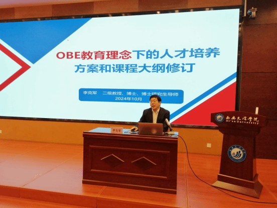 李克军副校长从问题导向出发,解读了OBE教育理念的缘起、OBE教育理念的核心内涵以及OBE教育理念下如何修订人才培养方案等方面内容;全面阐释了专业人才培养目标与毕业要求、课程体系与实践教学体系构建在人才培养方案和课程教学大纲编制过程中必须要遵循的规则;强调了人才培养方案制定必须要明确专业内外部需求与培养目标、培养目标与毕业要求、毕业要求与课程体系、毕业要求与教学内容之间的关系。