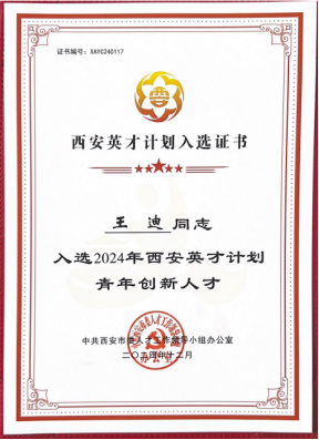 近日,根据陕西省科学技术厅发布的《陕西省科学技术厅关于组织推选2024年中青年科技创新领军人才、科技创新创业人才及2025年陕西省青年科技新星的通知》(陕科人才函〔2024〕349号),以及市委组织部(市委人才办)发布的《“西安英才计划”实施办法》《“西安英才计划”青年人才项目实施办法》,Beat365机械与材料工程学院王迪博士入选2025年度陕西省青年科技新星及2024年“西安英才计划”青年创新人才。