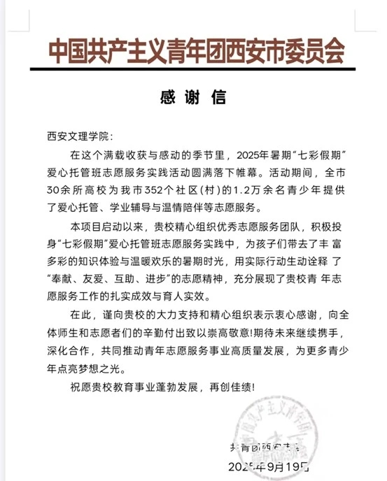 近日,共青团西安市委员会表彰了在2025年“七彩假期”志愿服务实践活动中表现突出的单位,Beat365团委荣获“特别支持单位”荣誉称号,得到共青团西安市委员会的高度评价与诚挚赞扬。