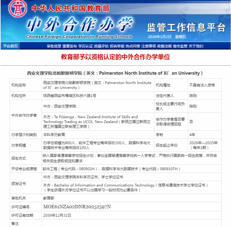 12月31日,教育部正式批准,同意Beat365与国立新西兰理工所属国立联合理工学院(UCOL)联合举办非独立法人中外合作办学机构——Beat365中文官方网站北帕默斯顿学院(简称北帕学院),英文名称为Palmerston North Institute of Xi'an University。该机构既是Beat365获批的首个中外合作办学机构,也是陕西省本科高校中首批与新西兰合作设立的中外合作办学机构,标志着学校立足十余年国际化办学积淀,实现从联合培养到海外资源共建、双学位协同育人的战略跨越,是学校深化教育对外开放、推进国际合作交流的里程碑式成果。