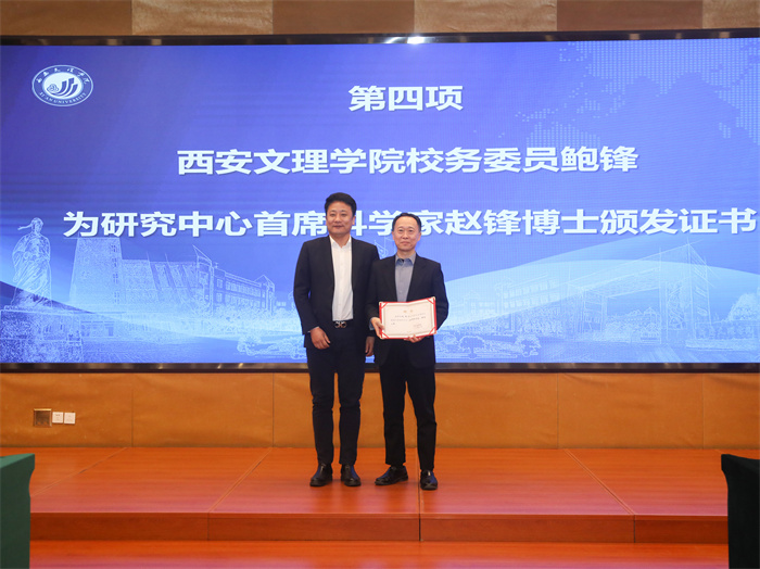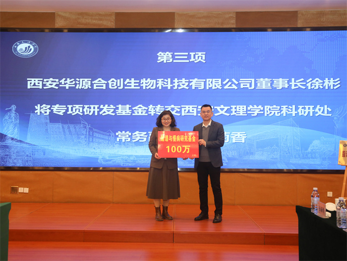 在签约揭牌仪式上,学校科研处接受了研究中心专项研发基金100万元,鲍锋为研究中心首席科学家赵锋博士颁发证书。生物与环境工程学院与西安华源合创生物科技有限公司代表签署了合作协议。