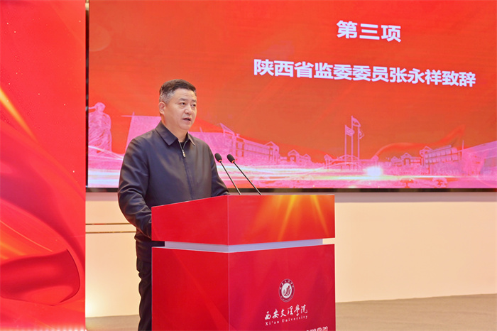 张永祥在致辞中指出,文理学院认真贯彻落实党的二十大精神和习近平总书记关于党的自我革命的重要思想,坚持走政校合作、创新发展之路,在纪检监察专业建设和人才培养、党风廉政建设基础理论研究、校园廉政文化建设等方面,取得了一系列显著成果,为推动西安纪检监察工作高质量发展贡献了文理智慧和力量。希望以成立纪检监察学院为新起点,持续发挥政校资源优势,深度融合,打造“立足西安、面向全国”的纪检监察人才培养主阵地,为纵深推进新征程纪检监察工作高质量发展作出新的更大贡献!