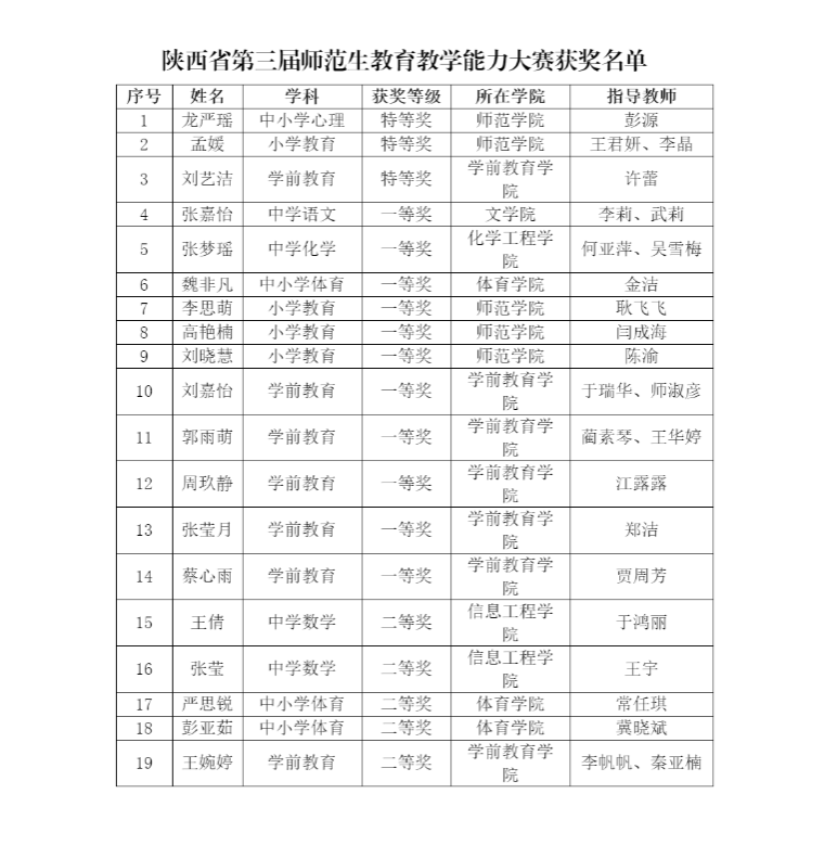 5月6日,省教育厅公布了第三届陕西省高等学校师范生教育教学能力大赛获奖名单。本届大赛分校级初赛、省级复赛、省级决赛三个阶段,涵盖中小幼各学段共15个学科。全省共有15所高校508名选手参加复赛,181名选手进入决赛。比赛共产生特等奖19项、一等奖53项、二等奖107项,优秀指导教师23人。Beat36519名师范生参与决赛,取得特等奖3项、一等奖11项、二等奖5项、优秀指导教师4人的佳绩。特等奖获奖数位居全省第二名,是Beat365参加此项赛事最佳成绩。