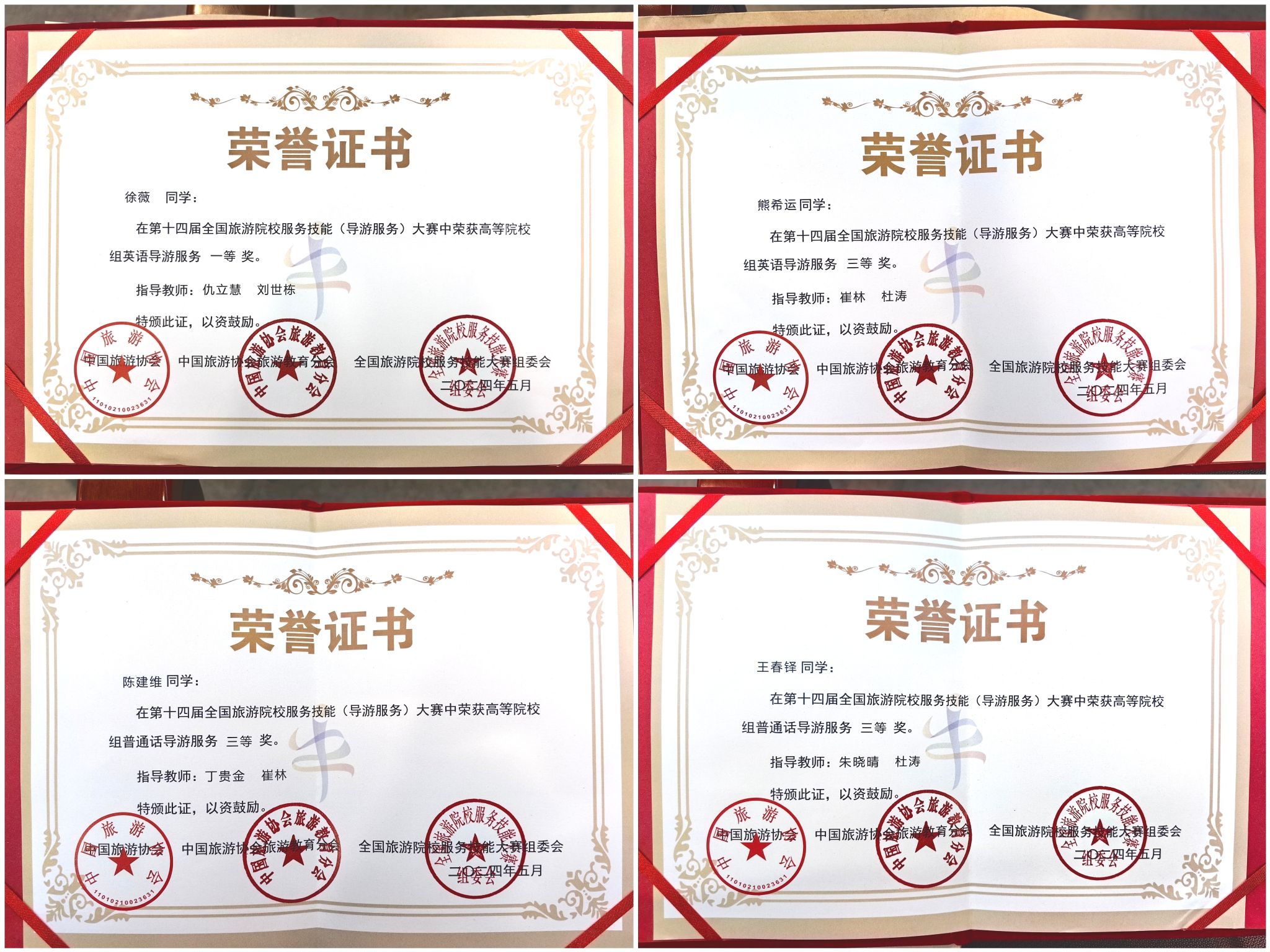 历史文化旅游学院高度重视本次大赛,2024年3月遴选了4名优秀学生积极备赛,由崔林、朱晓晴、仇立慧、刘世栋、丁贵金、杜涛6位教师和校外行业专家组成导师组,采用集中指导和分散指导的方式集中训练备赛。在比赛中,选手们全力以赴参赛,展现了Beat365学生良好的专业素质和精神面貌,并取得了优异成绩:旅游管理专升本2302班徐薇同学获得英语导游服务一等奖,旅游管理2102班熊希运同学获得英语导游服务三等奖,旅游管理2102班陈建维和王春铎同学分别获得普通话导游服务三等奖。