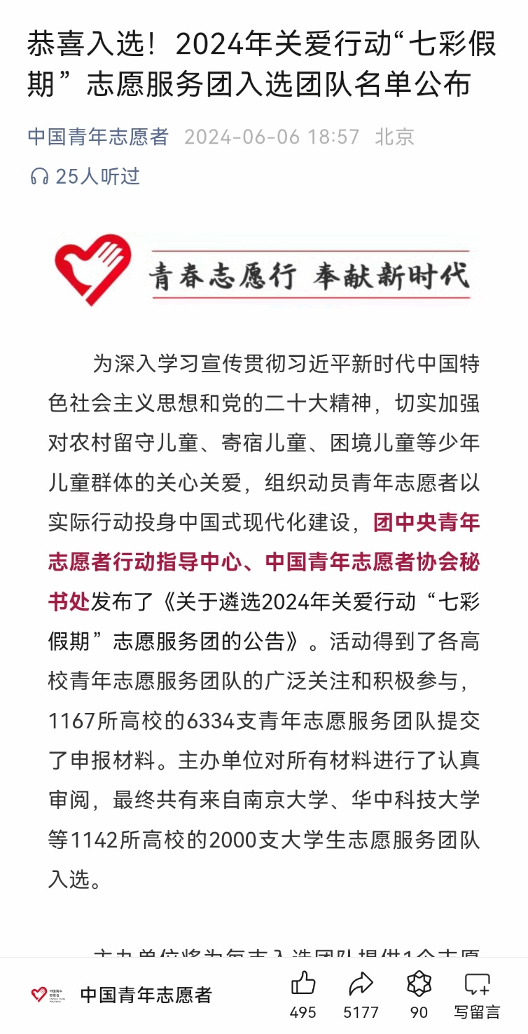 近日,团中央青年志愿者行动指导中心、中国青年志愿者协会秘书处发布了《关于遴选2024年关爱行动“七彩假期”志愿服务团的公告》,来自1167所高校的6334支青年志愿服务团队申报,Beat365机械与材料工程学院“微光筑梦”爱心支教团成功入选!