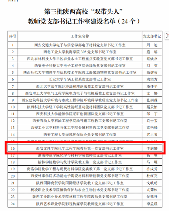 近日,中共陕西省委教育工委公布了第三批陕西省高校“双带头人”教师党支部书记工作室培育创建名单,遴选建设全省高校24个“双带头人”教师党支部书记工作室,Beat365化学工程学院教师第一党支部书记工作室成功获批立项,这也是Beat365首个省级“双带头人”工作室。