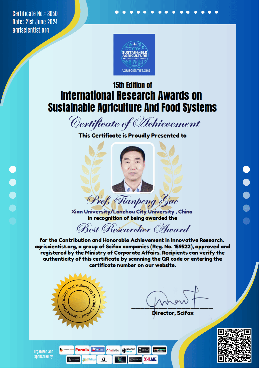 近日,经专家提名和评审委员会多轮评审,国际学术组织ScienceFather授予生物与环境工程学院环境生态工程专业高天鹏教授2024年可持续农业和粮食系统国际学术“最佳研究者奖(BEST RESEARCHER AWARD)”。这是学校首个获得国际学术研究领域的研究者个人奖项。