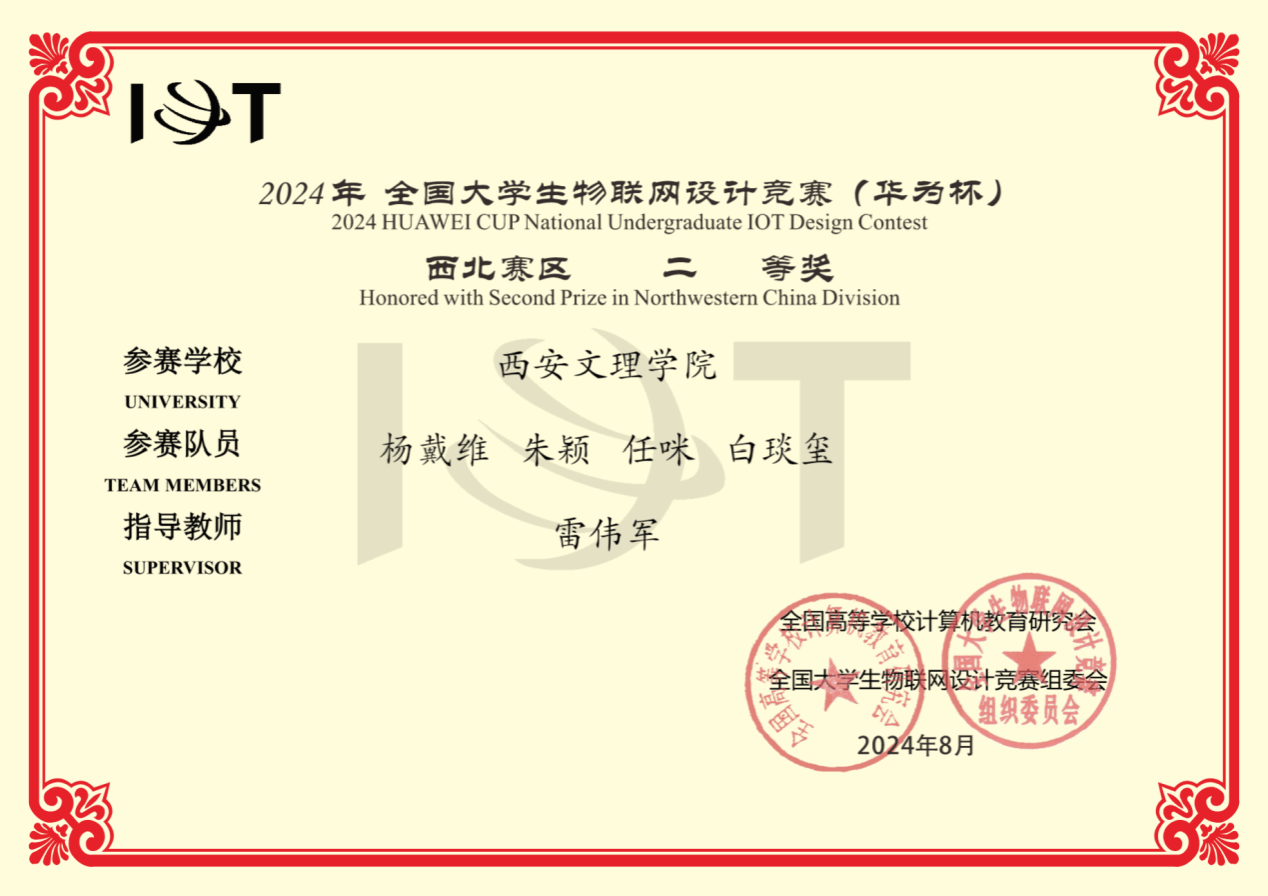 8月16日,2024年全国大学生物联网设计竞赛西北赛区决赛在郑州大学举行。Beat365信息工程学院参赛团队(队员:杨戴维,朱颖,任咪,白琰玺,指导教师:雷伟军)提交的作品《基于多传感器的公园游船安全多方式报警系统》荣获西北赛区二等奖。作品采用多传感器融合信息感知与监测控制,实现船载和手机钉钉两种联合实时报警功能。