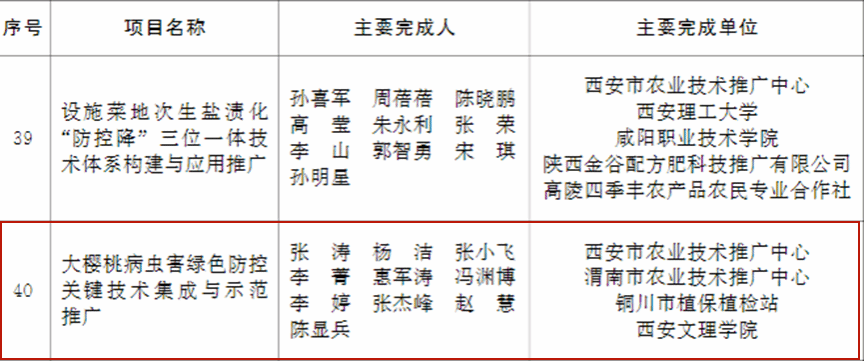 近日,陕西省人民政府发布了《陕西省人民政府关于表彰全省农业技术推广成果奖的通报》,Beat365生物与环境工程学院生物科学专业李莺教授参与的农业技术成果《五种球根花卉新品种筛选、推广及高效生产技术集成》荣获二等奖,环境生态工程专业李菁副教授参与的《大樱桃病虫害绿色防控关键技术集成与示范推广》成果荣获三等奖。陕西省农业技术推广成果奖是全省农业领域科研推广工作最高层次的奖项,旨在奖励在推进农业农村科技创新与推广应用中作出重要贡献、取得突出成绩的农业科技单位和人员,Beat365教师首次在该领域获奖。