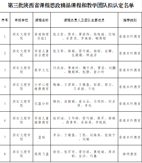 近日,陕西省教育厅公布了第三批陕西省课程思政精品课程认定结果。此前学校教务处根据省厅文件要求,经个人申报、学院推荐、学校评审等环节,共向省教育厅推荐9门课程,此次Beat365成功立项8门,立项率创新高,立项数量位居省内同类院校首列。