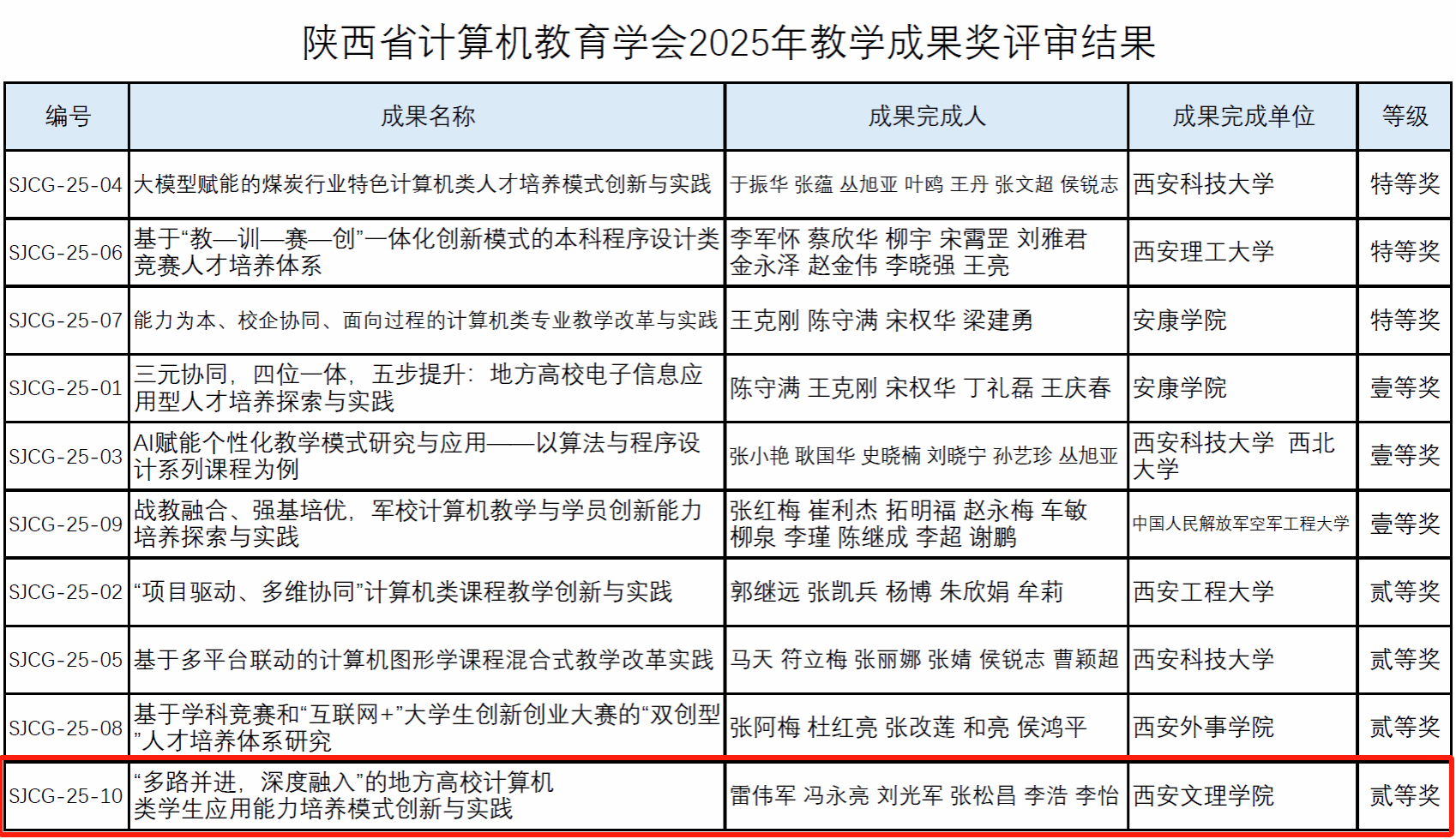雷伟军教授团队申报的《“多路并进,深度融入”的地方高校计算机类学生应用能力培养模式创新与实践》获评教学成果二等奖;徐阳扬副教授编写的教材《Arduino应用开发》荣获优秀教材一等奖;赵宁社副教授成功获批学会教改项目。这些成果充分展现了信工学院计算机教育领域的创新实力与教学水平。
