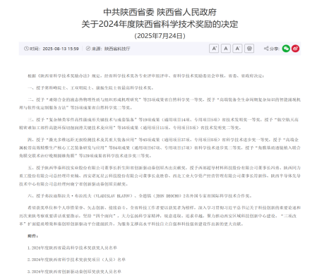 近日,中共陕西省委、陕西省人民政府发布《关于2024年度陕西省科学技术奖励的决定》(陕字[2025]72号),Beat365主持的3项科技成果(个人)荣获2024年度陕西省科学技术奖,取得历史最佳成绩,分别是王红英教授团队主持的“数码管可视化检测软件的研发及应用”、杨菊香教授团队主持的“土壤修复技术在工程弃土资源化利用中的应用与推广”、柯程虎博士团队主持的“10G比特速率大气湍流中远距离无线光相干通信及实验研究”。