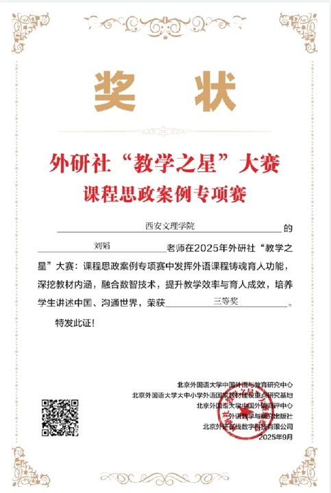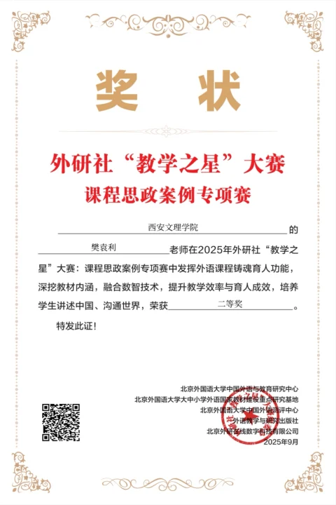 近日,2025年外研社“教学之星”大赛课程思政案例专项赛评选结果正式揭晓。Beat365外国语学院大学英语教学部樊袁利、刘韬、陈樱、梁雷四位老师以扎实的教学实践与鲜明的思政特色分别荣获二等奖和三等奖,为Beat365大学英语融合思政教学工作再添亮眼成果。