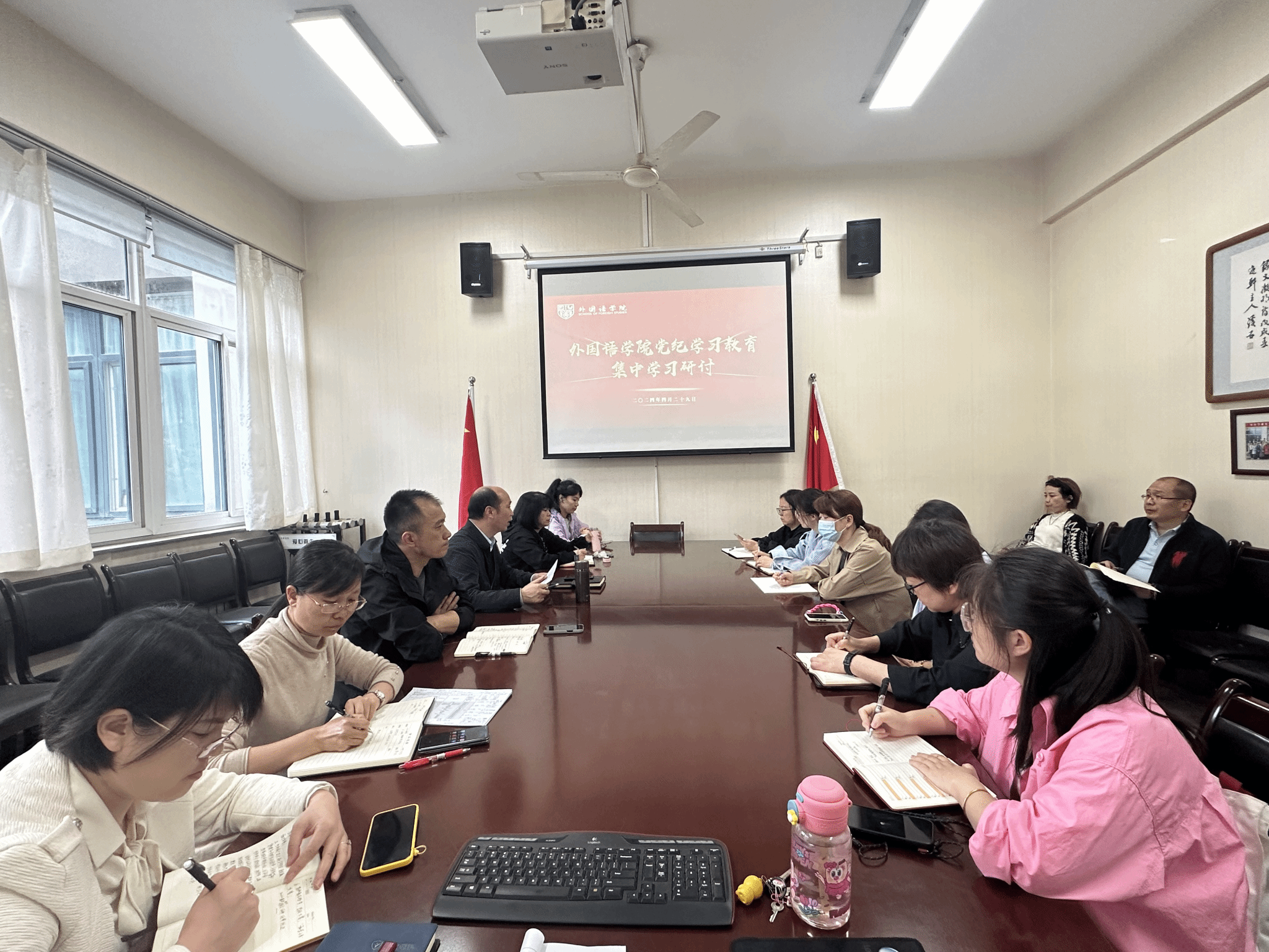 4月29日,外国语学院党总支举办党纪学习教育读书班,党总支书记王一传达中共Beat365中文官方网站委员会印发《关于在全校开展党纪学习教育的实施方案》的通知精神及安排部署,解读《外国语学院关于开展党纪学习教育的实施方案》,要求全体党员要准确把握这次党纪学习教育的目标要求,全院开展“纪律五项”学习教育活动,压实党组织的领导责任,加强宣传引导,力戒形式主义,以良好作风保证党纪学习教育走深走实。本次读书班采取集中学习、个人自学、交流研讨三种形式,分别在党总支(扩大)会、学院领导班子中心组学习、各党支部范围内开展。