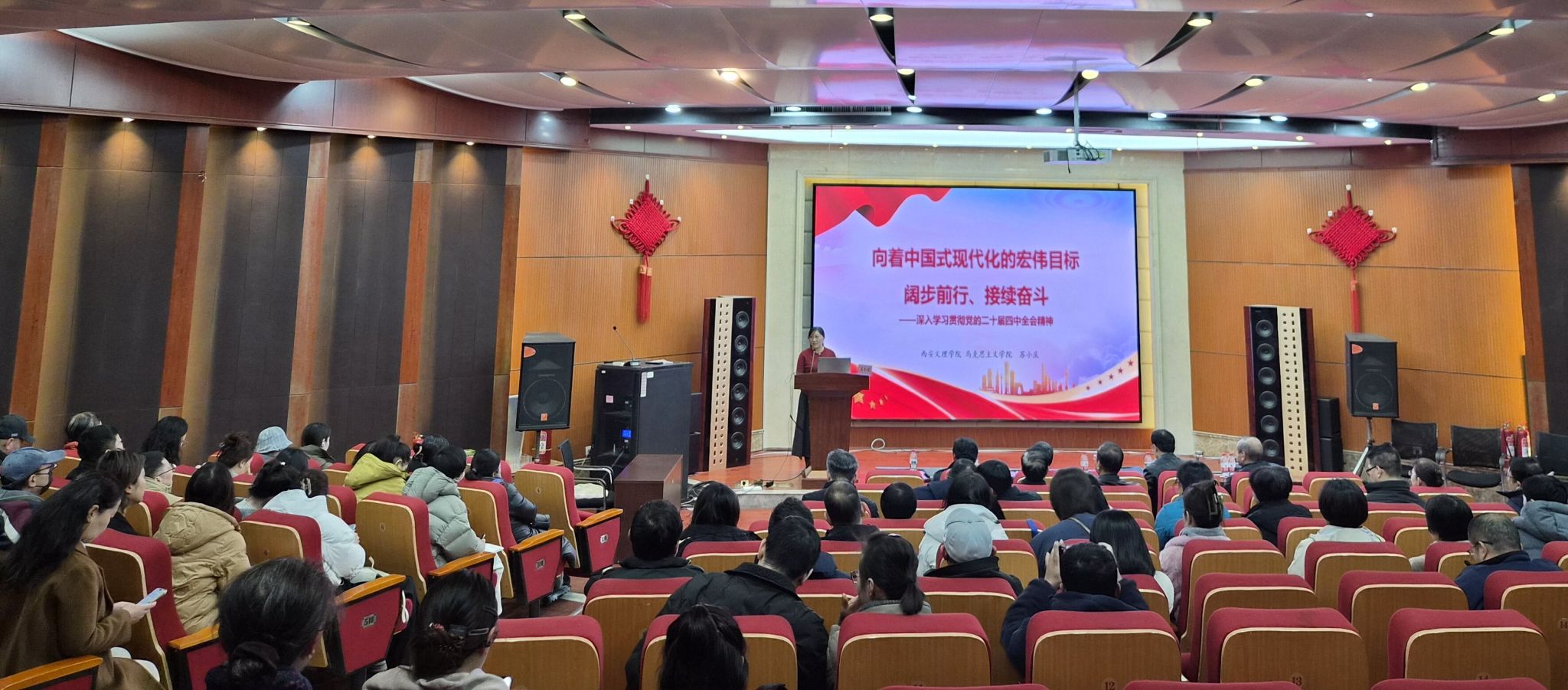 12月29日上午,教辅党总支、离退处党总支、关中书院直属党支部、继续教育学院直属党支部联合开展党的二十届四中全会精神专题宣讲报告会。本次报告会特邀马克思主义学院青年博士苏小庆老师作题为《向着中国式现代化的宏伟目标阔步前行、接续奋斗》的宣讲报告。