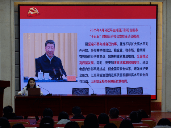 本次宣讲由马克思主义学院杨静副教授主讲。她以时间为轴梳理我国历次五年规划发展脉络,聚焦2025年10月召开的党的二十届四中全会及 “十五五” 规划建议,从指导思想、主要目标、重点任务等方面系统解读全会精神,强调师生要立足专业岗位,将学习感悟转化为报国行动。