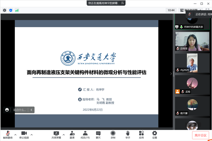 6月22日下午,机械与材料工程学院与西安交通大学材料科学与工程学院2019级联合培养研究生阶段性工作汇报暨学术交流会在腾讯会议线上成功举行。校学位与研究生管理处副处长任宏江教授,机械与材料工程学院副院长边培莹...