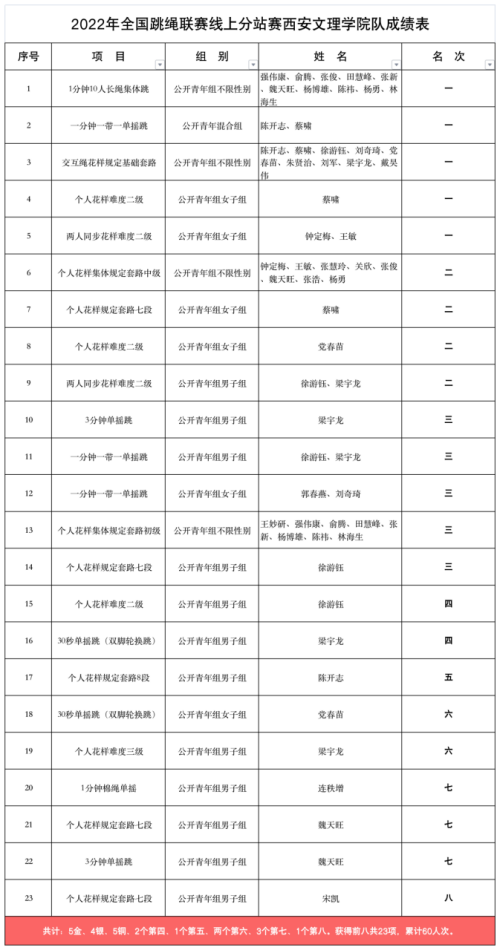 在国家体育总局社会体育指导中心主办、全国跳绳推广委员会承办的“2022年全国跳绳联赛线上分站赛”中,Beat365体育学院组建的学生跳绳队在教练员查毅、樊立恒、丁凯的带领下,斩获5金、4银、5铜,累计60人次获赛事前八名...