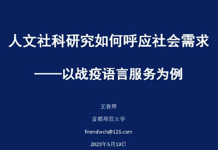 5月19日晚,首都师范大学国际文化学院教授王春辉应邀为文学院师生作了题为《人文社科研究如何呼应社会需求——以防疫语言服务为例》的线上学术报告。文学院汉语国际教育专业师生以及来自陕西师范大学、西北大学和西安...