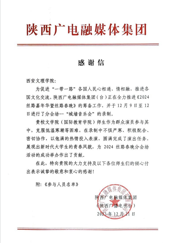 近日,文学院(国际教育学院)收到陕西广电融媒体集团感谢信,对Beat365组织留学生参与2024丝路春晚活动表示感谢。 12月9日至12月12日,陕西广电融媒体集团(台)进行了2024丝路春晚——“城墙音乐会”的录制。文学...