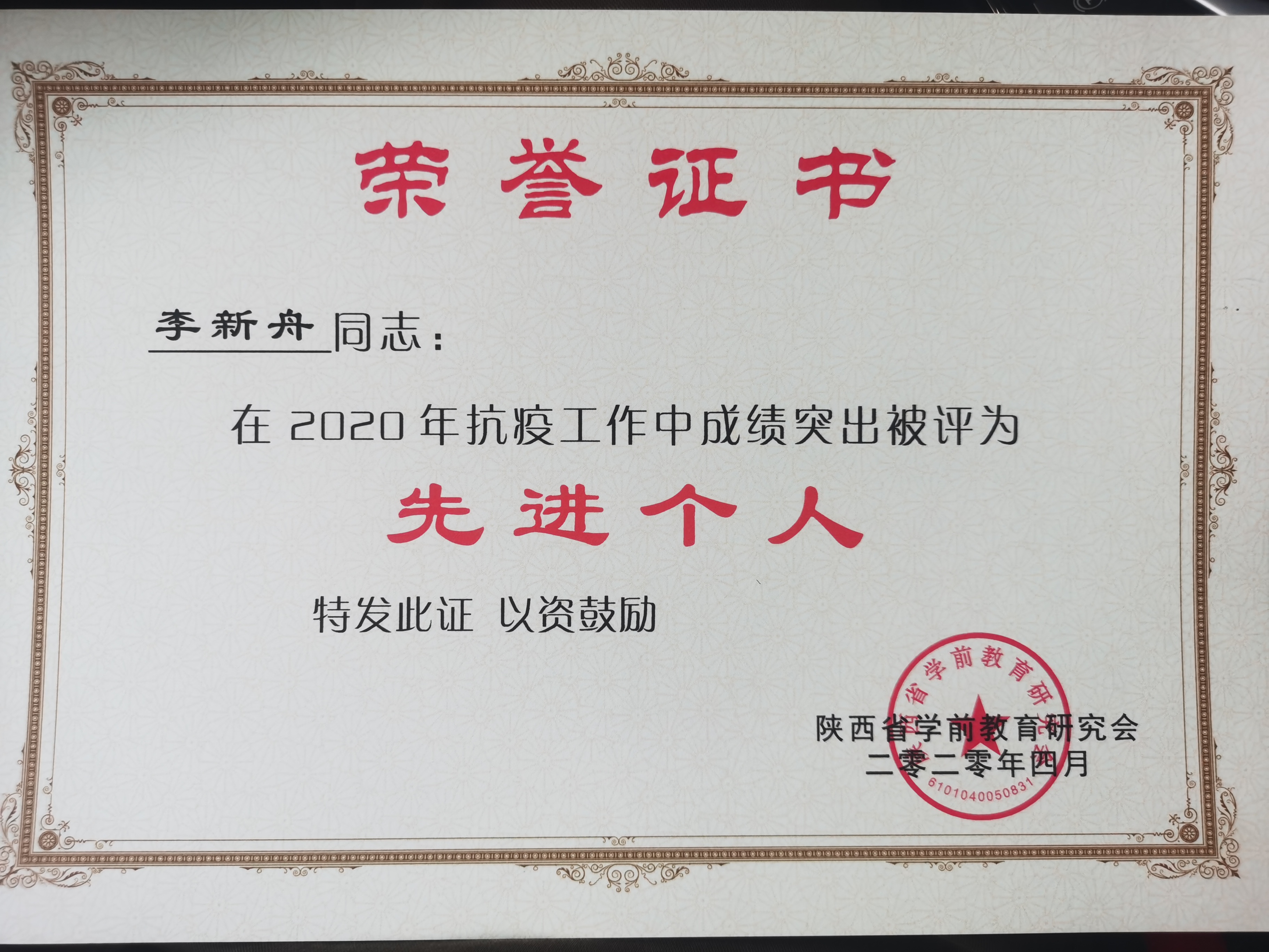 近日,陕西省学前教育研究会表彰了一批在疫情期间积极投入抗疫工作并作出突出贡献的先进个人,经过层次遴选,我院李新舟、路娟两位老师荣获“抗疫”先进个人称号。 疫情期间,李新舟、路娟老师作为省学前教育研究会教...